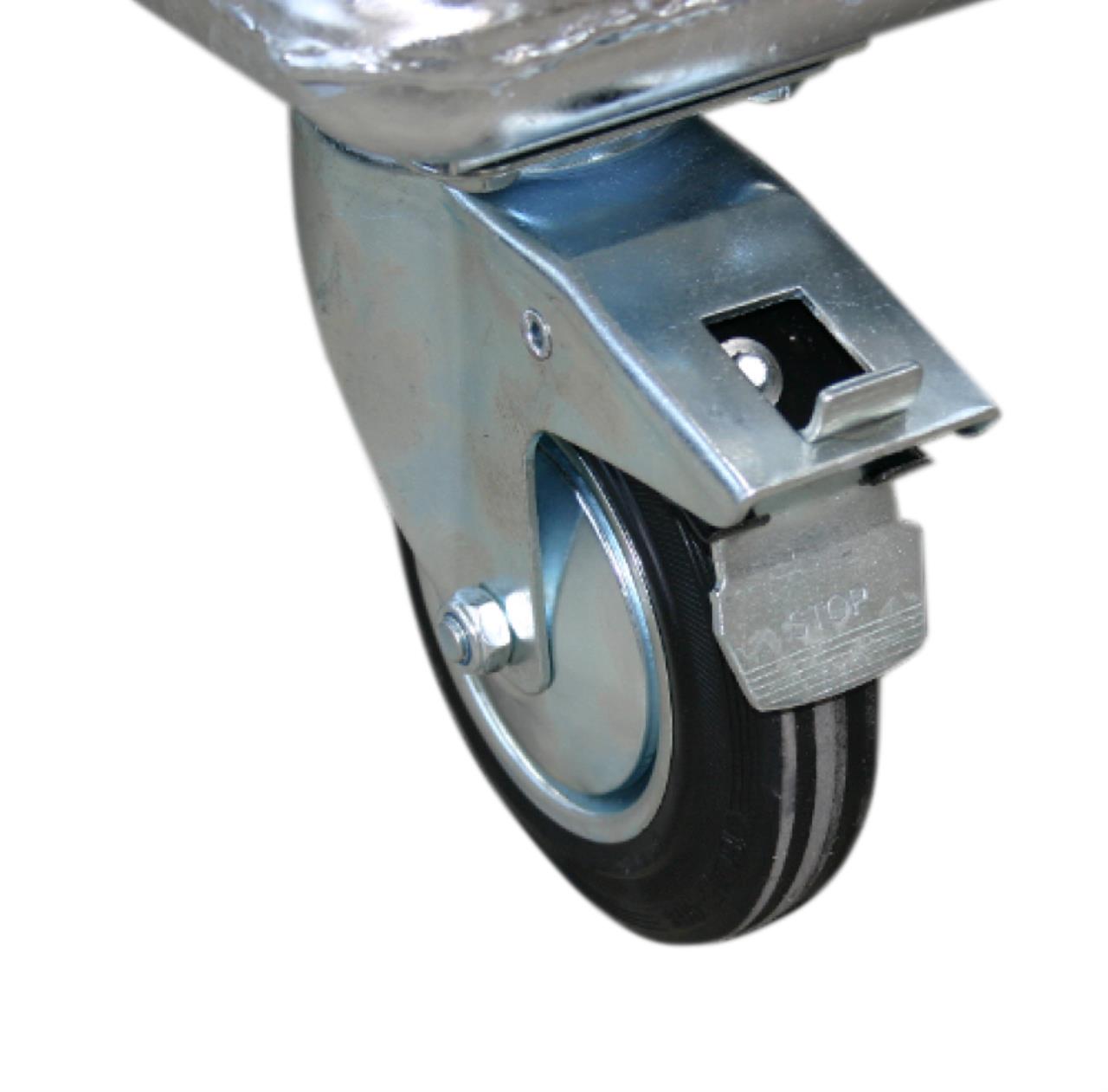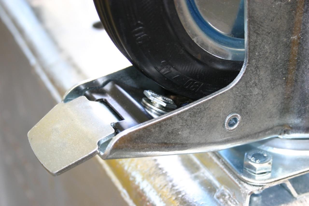 Mit eingebautem Deckelheber und 4 Stück Lenkrollen, wovon eine Rolle gebremst ist.