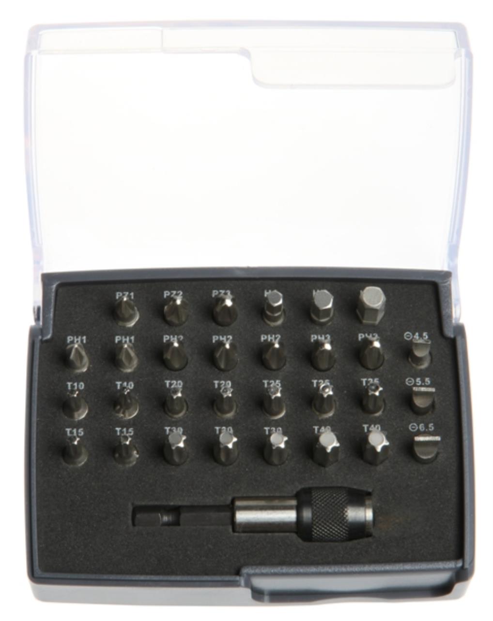 31-teiliges Bit-Set mit Schnellwechselhalter. Inklusive kompakter Box mit Gurtanstecklasche.