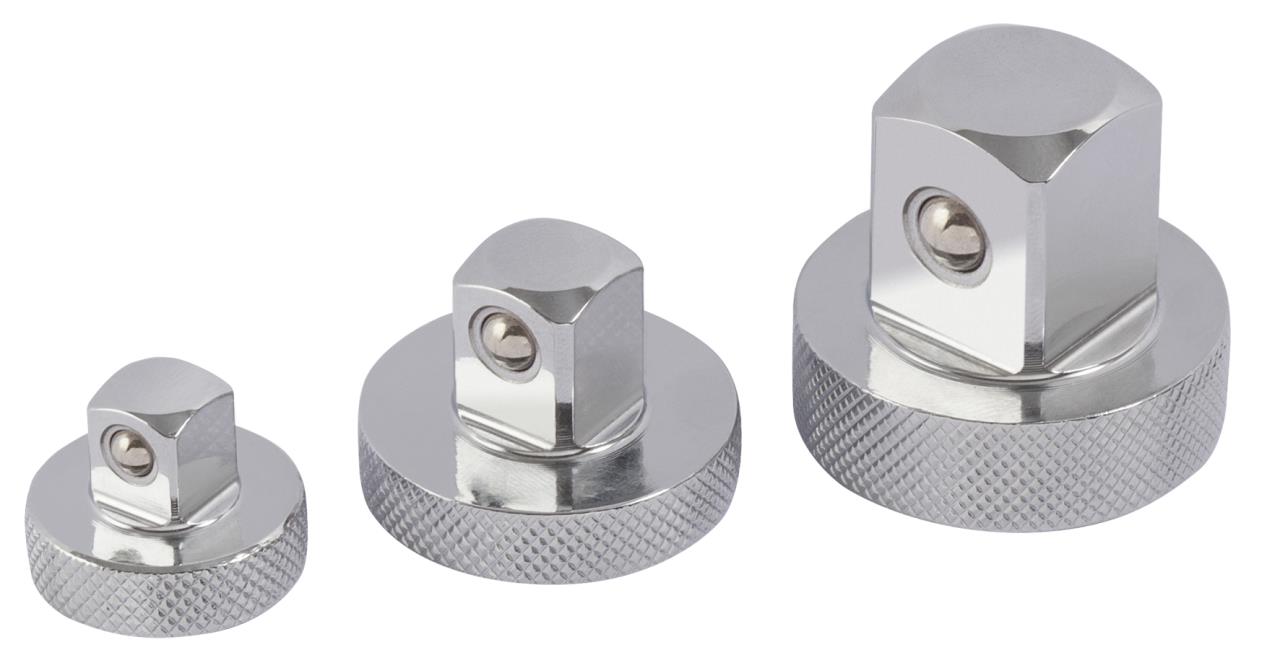 Jeu d'adaptateurs composé de 3 pièces de transition pour entraînement 1/4", 3/8" et 1/2". Peut être utilisé si la douille et le cliquet ont des entraînements différents. Solution pratique et peu encombrante.