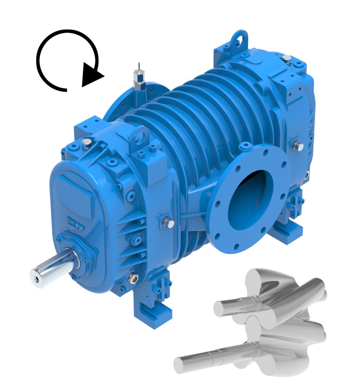 Le compresseur possède deux arbres à pistons rotatifs trilobés. Il ne nécessite aucune lubrification car aucun des éléments ne se touche. La forme spiralée des lobes garantit une rotation sans vibrations.