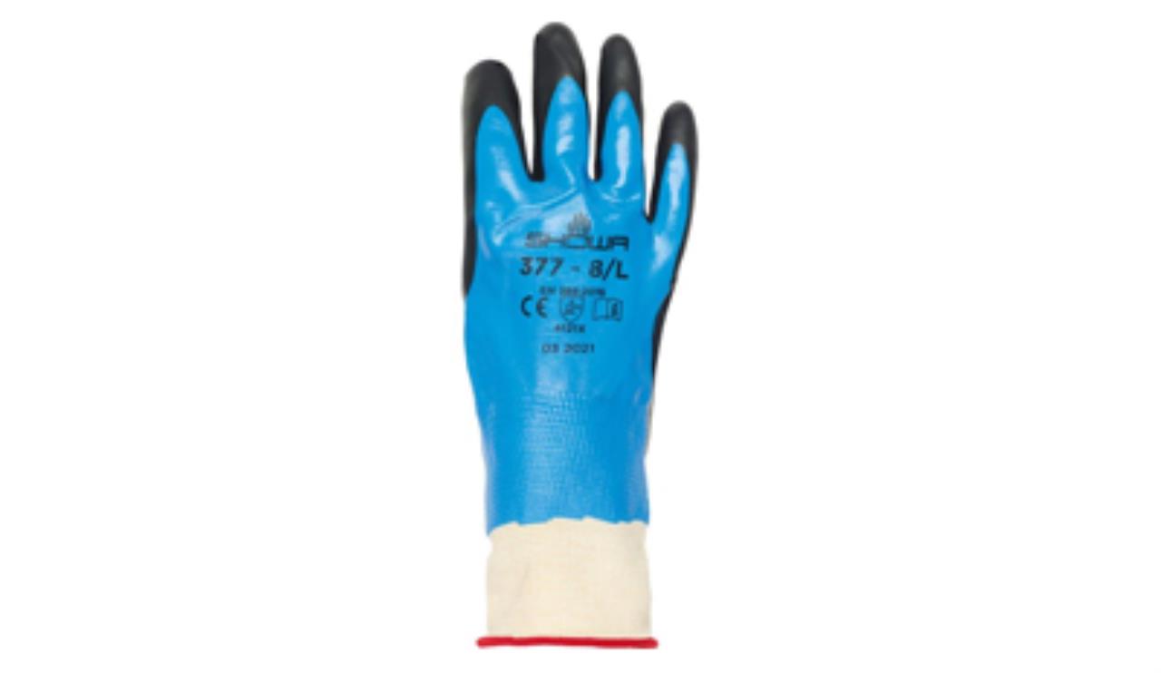 Schutzhandschuhe SHOWA aus Polyester-/Nylon-Gewirk mit zweifacher Nitril-Vollbeschichtung, glatte Oberfläche, Frauengrösse 7/M, Männergrössen 8/L und 9/XL.