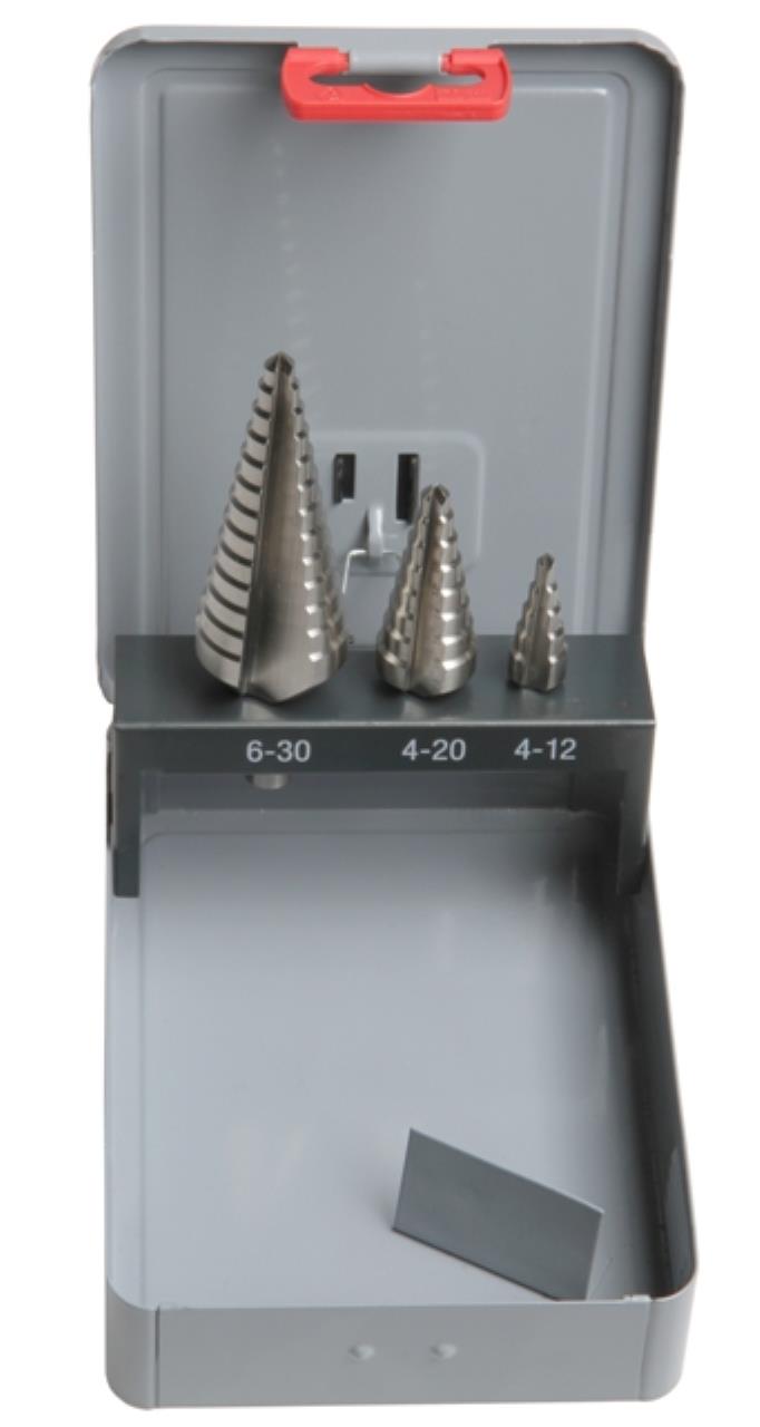 Stufenbohrersatz HSS 3-teiliger HSS-Stufenbohrersatz in Metallbox. Technische Daten 3-teilig Varianten Bitte die Tabelle nach links scrollen, um alle Informationen zusehen und einen Artikel in den Warenkorb zu legen. Art.-Nr. Version Inhalt 1 Inhalt [Stück] Material Oberfläche Gewicht [kg] VPE Ausführung VP [CHF] MWSt 8.1% exkl. 604 110 Form C, Rundschaft Ø 4 - 12mm, Ø 4 - 20mm, Ø 6 - 30mm 3 HSS gehärtet 0.56 1 Metallbox 159.00 Lagerbestand: 10+ Stück