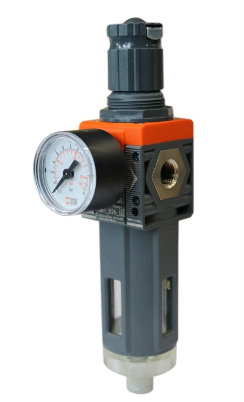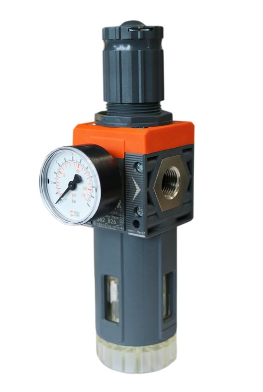 Stufenloses Druckreduzierventil mit Wasserabscheider kombiniert. Der eingestellte Druck ist am Manometer ablesbar. Modul kombiniert die Funktion der Filterung, Kondensatabscheidung und Druckregelung.