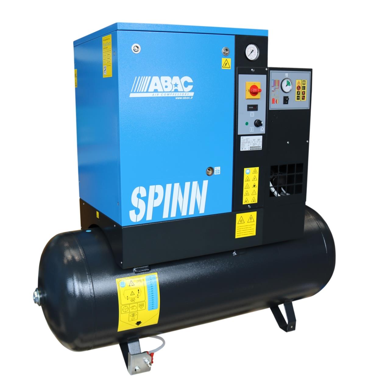Schraubenkompressor mit integriertem Kältetrockner und Drucklufttank. Steuerung manuell. Die ABAC SPINN Serie zeichnet sich aus durch Kompaktheit, Effizienz sowie platzsparendes Design. Für konstanten Luftbedarf im Dauerbetrieb geeignet dank modernster Schraubentechnologie.