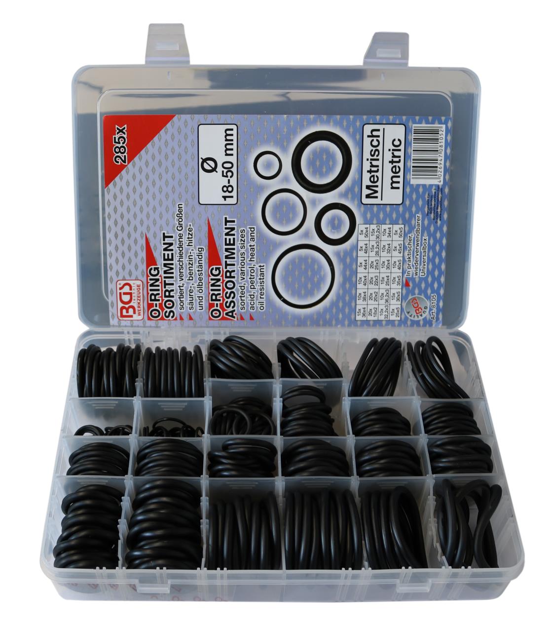 Umfangreiches Sortiment mit O-Ringen welche säure-, benzin-, hitze- und ölbeständig sind. Nicht für Trinkwasser geeignet.