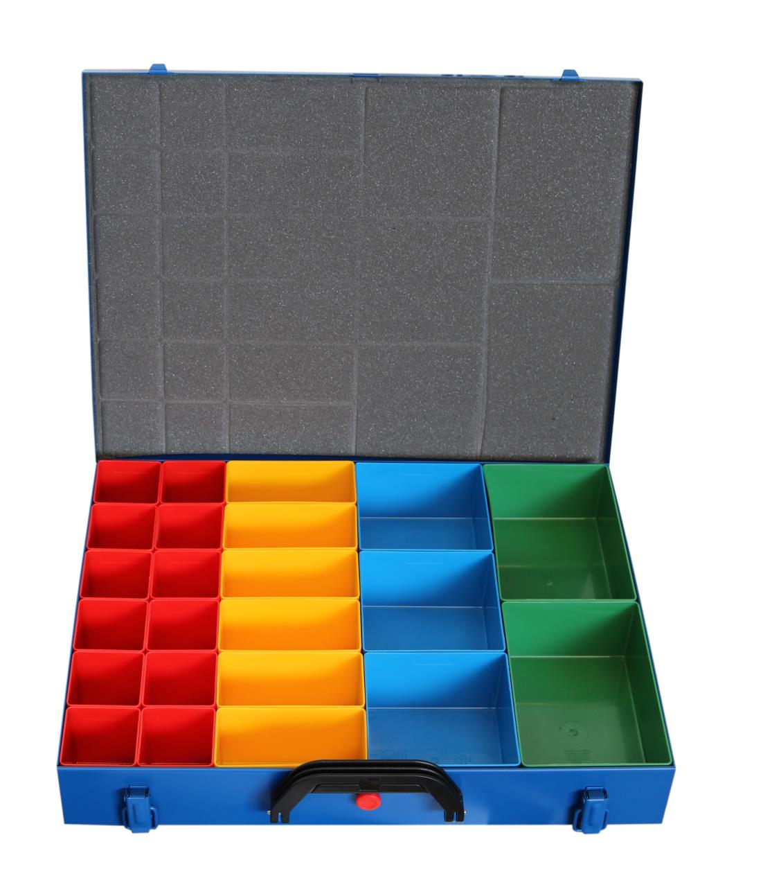 Sortimentkoffer Metall - 2 Verschlüsse und Deckelsicherung - 23 lose Einsätze - Grössen: 2x 160 x 105mm 3x 105 x 105mm 6x 105 x 50mm 12x 50 x 50mm Technische Daten mit Tragegriff Fächer farbig Varianten Bitte die Tabelle nach links scrollen, um alle Informationen zusehen und einen Artikel in den Warenkorb zu legen. Art.-Nr. Dimension LxBxH [mm] Gewicht [kg] Farbe Ausführung VP [CHF] MWSt 8.1% exkl. ZZ EH 1200 440 x 330 x 66 3.5 blau Metallbox 69.00 Lagerbestand: 3 Stück